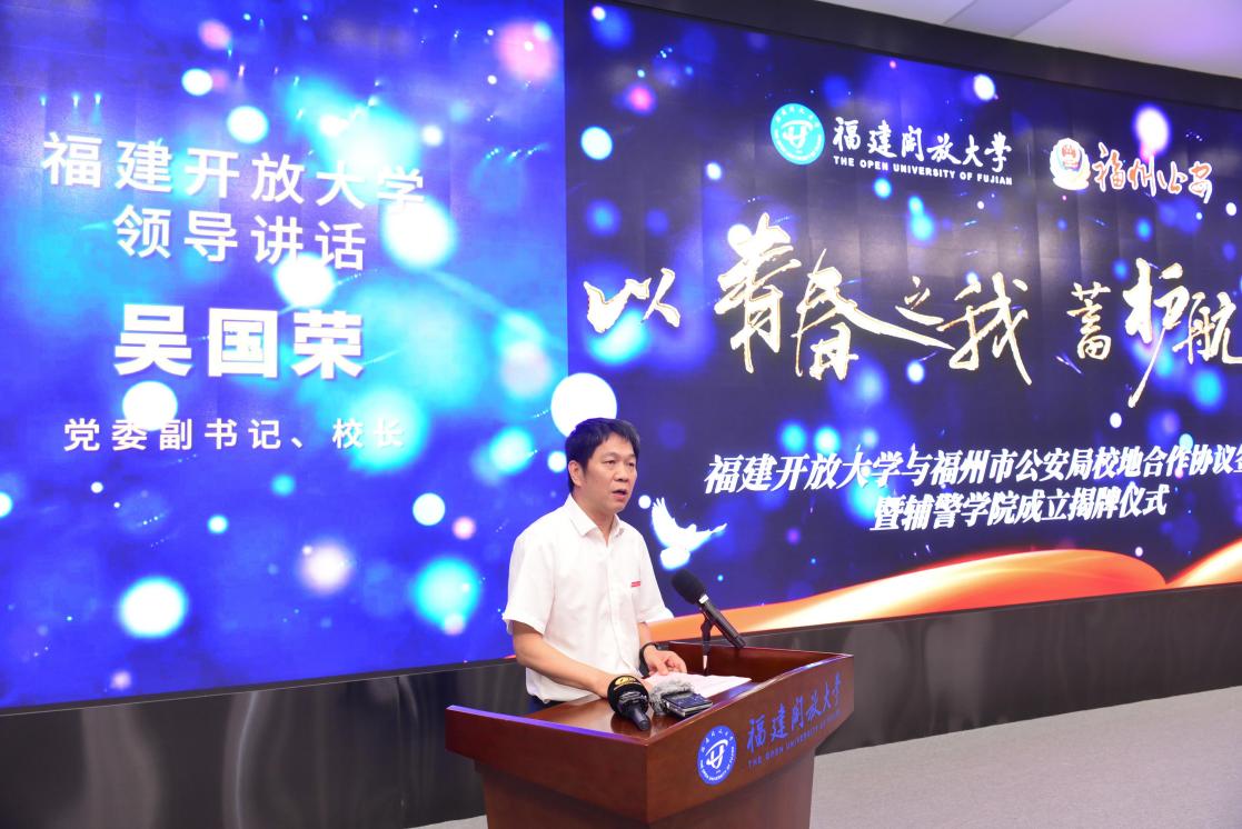 学校党委副书记、校长吴国荣讲话中,对辅警学院成立表示热烈祝贺。他指出,成立辅警学院既是我校为民办实事、服务社会的有益实践,又开启了“互联网+”背景下辅警群体培养模式改革的崭新航程。希望以此为契机,充分发挥各自优势,在学历教育、职业技能培训、智力服务、文化引领等方面,构建全面战略合作关系和长效合作机制。他表示,下一步,学校将在进一步提升辅警学院教学和学习支持服务水平、丰富辅警学员终身教育发展通道、努力为辅警学员提供免费职业技能培训和将辅警学员纳入“福建省终身教育学分银行”四个方面持续着力,实现双方资源共享最大化、育人成果最大化、指导实践最大化,推动辅警学院更好地发挥在辅警队伍建设中的重要作用,有力推动人才培养工作的顺利开展。