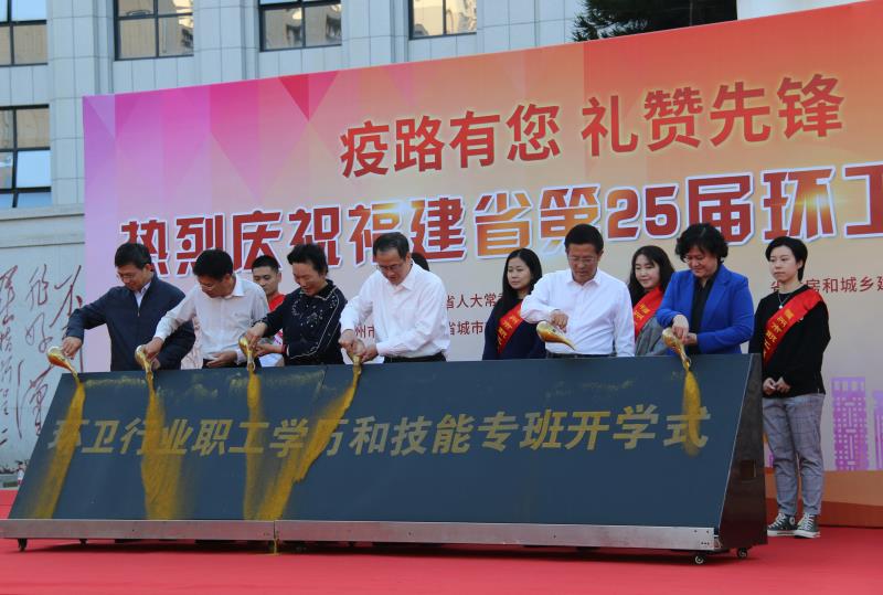 省人大常委会副主任、省总工会主席黄琪玉,省人大常委会环境与城乡建设工作委员会主任朱华,省住房和城乡建设厅党组书记、厅长林瑞良,省总工会党组书记、副主席丁文清,福州市委常委、统战部部长、市总工会主席、一级巡视员陈晔,福建广播电视大学党委副书记马成斌共同挥洒金沙,正式启动了福建省环卫行业职工学历和技能专班开学式。两位环卫职工学员代表接受主持人现场采访,畅谈参加学历和技能专班的初衷和期待。