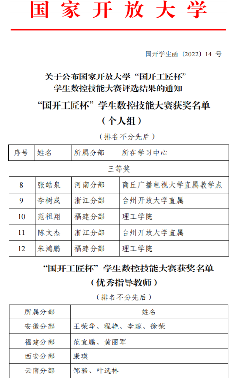 继我校理工学院5位教师获得国家开放大学首届工学科类专业教师教学技能大赛奖项之后,最近又喜获奖项!近日国家开放大学“国开工匠杯”学生数控技能大赛的评选结果已揭晓。理工学院选送的机械设计制造及其自动化本科学生朱鸿鹏、范祖翔荣获三等奖,黄丽军、范宜鹏两位老师荣获优秀指导教师称号。