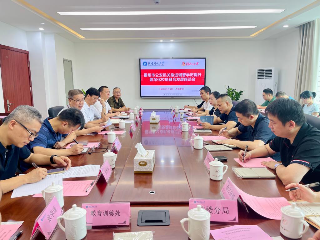 2023年9月5日上午,学校在左海校区举办福州市公安机关推进辅警学历提升暨深化校局融合发展座谈会,我校和福州市公安局就校局同城一体化发展及辅警学历提升工作进行研究交流,并对2023年秋季辅警学院招生作进一步动员部署。学校招生与体系建设办公室、理工学院,福州市公安局教育训练处、交警大队及各县、区公安局政治部负责人等参加了会议。