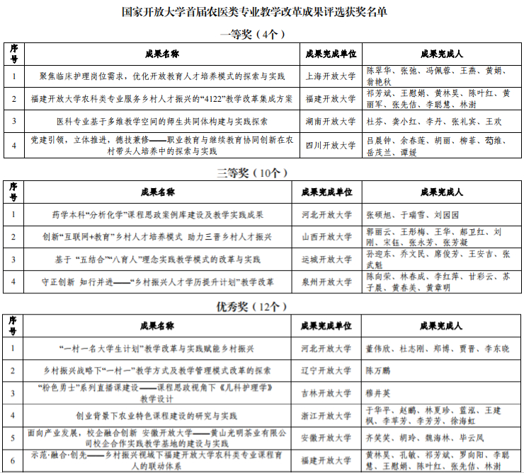 据悉,此次评选是国家开放大学首次举办以专业教学为主题的教改成果评选活动,活动共收到24个分部的62个参赛作品,共评选出首届农医类专业教学改革成果一等奖4个、二等奖6个、三等奖10个、优秀奖12个,优秀组织奖8个。