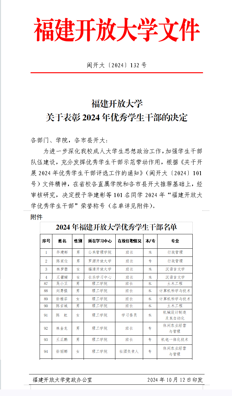 为进一步深化我校成人大学生思想政治工作,加强学生干部队伍建设,充分发挥优秀学生干部示范带动作用,学校授予来自直属学院和各市县开大的101名同学2024年“福建开放大学优秀学生干部”荣誉称号,我院23秋土木工程专业吴小卫、24春计算机科学与技术专业刘勇强、23春计算机科学与技术专业徐雅芬、23春土木工程专业陈吉城、23春机械设计制造及其自动化专业陈虹、22秋休闲农业经营与管理专业林金龙、22秋机电一体化技术专业王正鹏、22秋休闲农业经营与管理专业徐丽娜等8名同学获此殊荣,